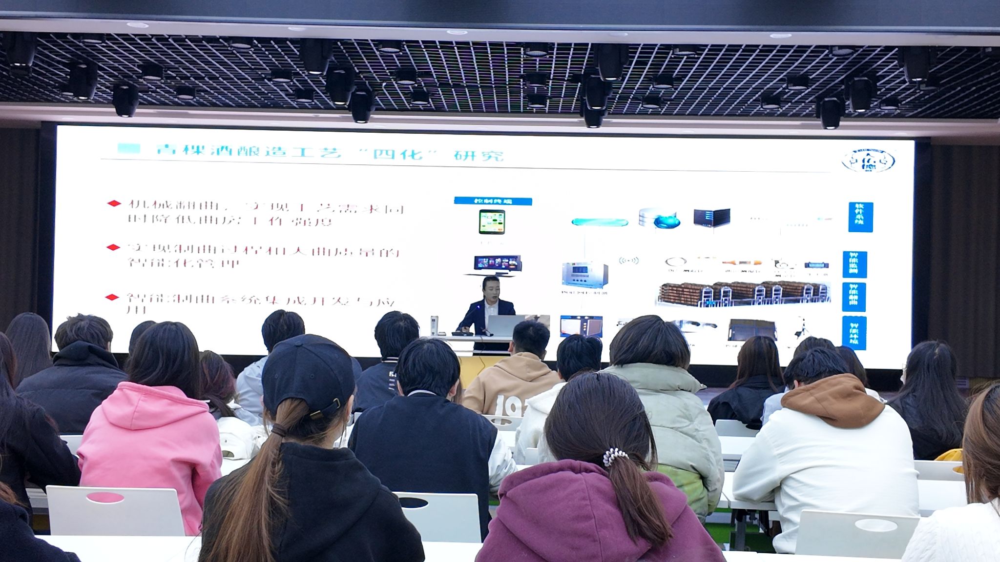 报告从青稞原料特性、青稞酒的品质特征、产品核心竞争力、企业技术创新实践以及天佑德公司的技术软硬实力等五个方面就行了讲解。李善文总监结合生产实践经验,深入浅出地解析了青稞酒从原料到产品的全链条研发思路与技术路径,为在场师生带来一场融合理论与实战的知识盛宴。